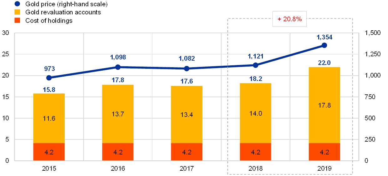 The euro equivalent value of the ECB’s holdings of gold and gold receivables increased by €3.8 billion to €22.0 billion in 2019 (see Chart 3), owing to an increase in the market price of gold in euro terms, while the size of these holdings in fine ounces remained unchanged. This increase also led to a rise in the ECB’s revaluation accounts, which increased by the same amount (see Section 1.3.2 “Financial resources”).