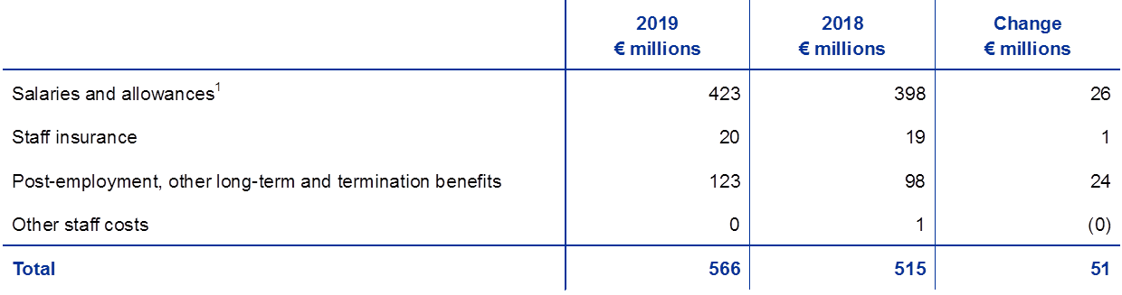 Staff costs increased in 2019 mainly owing to the higher average number of staff employed by the ECB and higher costs in relation to other long-term benefits, mainly as a result of the use of a lower discount rate for the actuarial valuation at the end of 2019 (see note 12.3 “Sundry”).