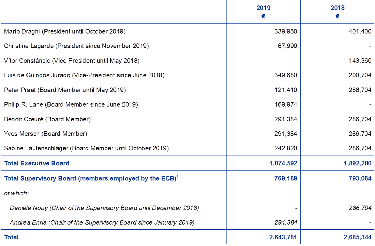1) This total excludes the salary of the Vice-Chair of the Supervisory Board (Sabine Lautenschläger until February 2019 and Yves Mersch since October 2019), which is reported with those of the other members of the Executive Board.