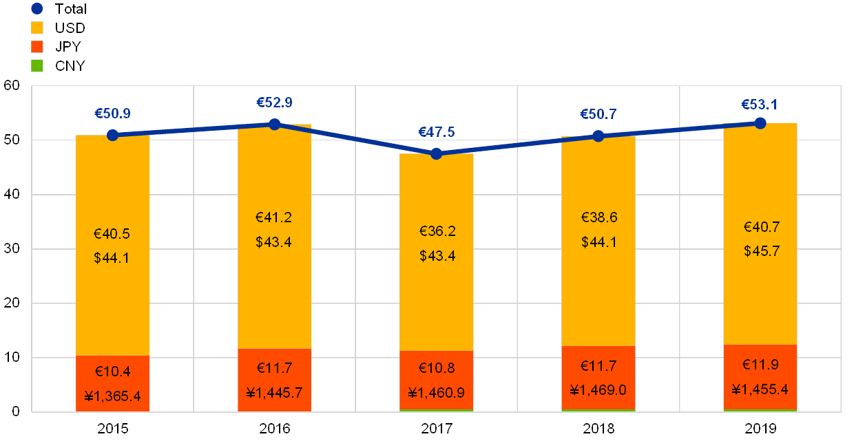 The ECB’s net foreign currency holdings[8] of US dollars, Japanese yen and Chinese renminbi increased in euro terms by €2.4 billion to €53.1 billion (see Chart 4), owing to the reinvestment of the income received during the year from these holdings and the depreciation of the euro against the US dollar and Japanese yen. The depreciation of the euro is also reflected in the higher balances in the ECB’s revaluation accounts (see Section 1.3.2 “Financial resources”).