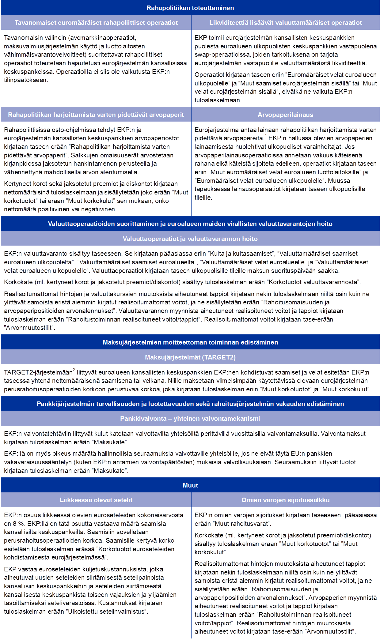 Eurojärjestelmässä rahapolitiikkaa toteutetaan hajautetusti, joten myös rahapoliittiset operaatiot näkyvät EKP:n ja euroalueen kansallisten keskuspankkien tilinpäätöksissä hajautusperiaatteen mukaisesti. Taulukossa 1 on yhteenveto tärkeimmistä EKP:n tehtävän mukaisista operaatioista ja toiminnoista sekä siitä, miten ne vaikuttavat EKP:n tilinpäätökseen.