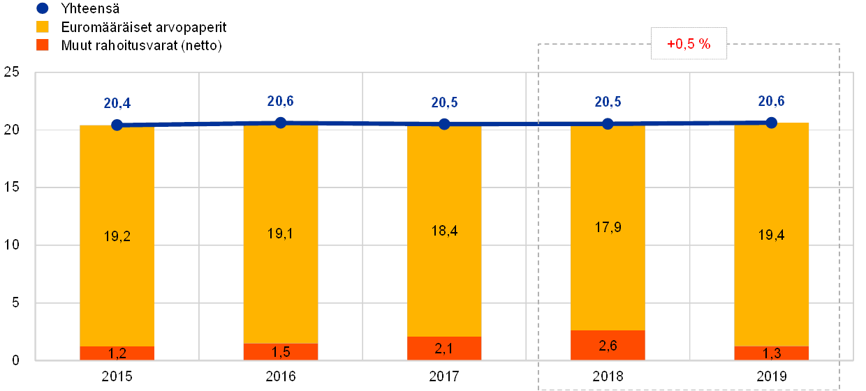 Vuonna 2019 EKP:n omien varojen sijoitussalkun arvo pysyi käytännössä ennallaan (ks. kuvio 7). Salkku sisältää pääasiassa euromääräisiä arvopapereita, jotka arvostetaan vuoden lopun markkinahintaan.