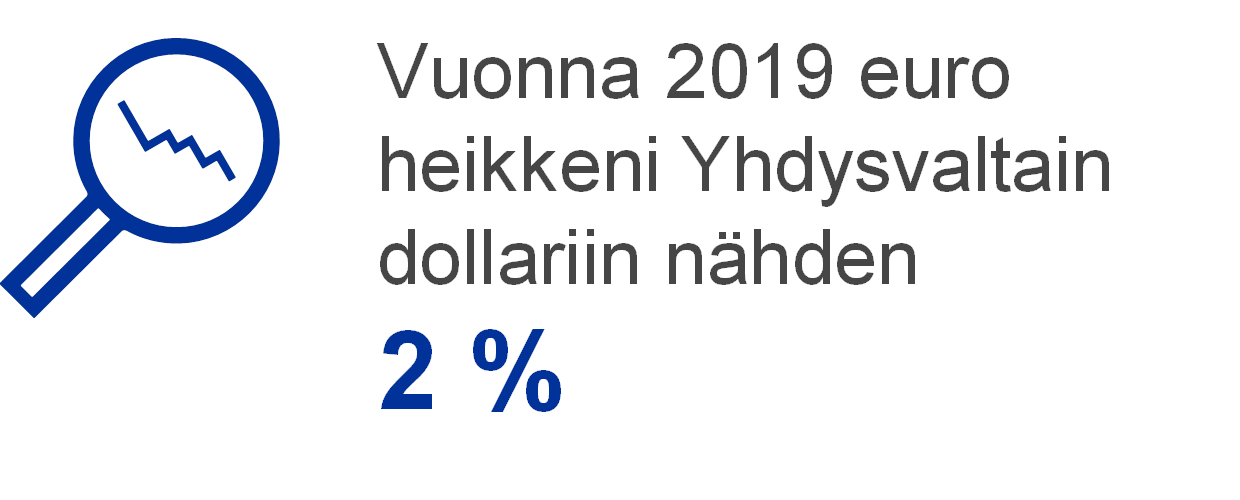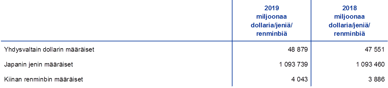 EKP:n valuuttavaranto koostui edelleen valtaosin Yhdysvaltain dollareista, joiden osuus koko varannosta oli vuoden 2019 lopussa noin 77 %.