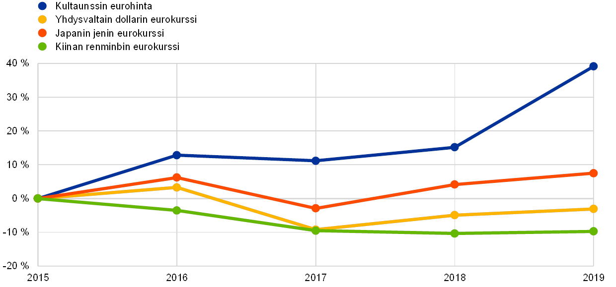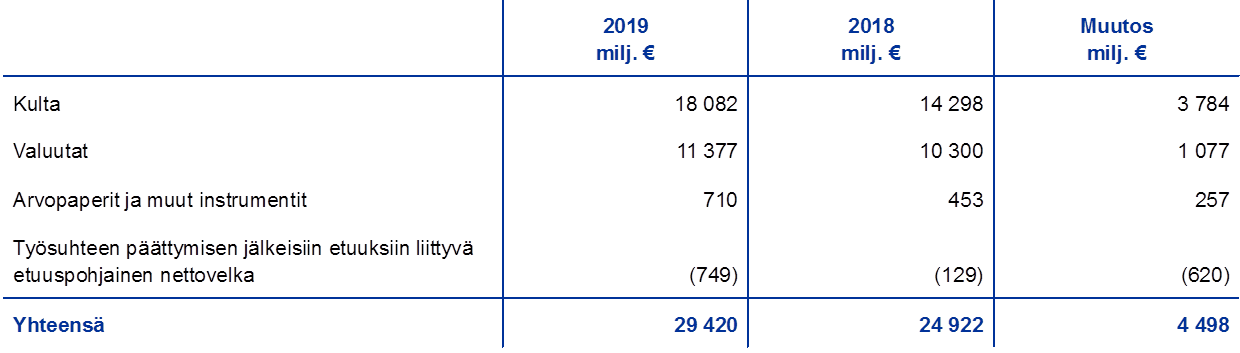 EKP:n kultavarannon unssimäärä pysyi ennallaan vuonna 2019, mutta kullan ja kultasaamisten euromääräinen arvo nousi 3,8 miljardia euroa eli 22,0 miljardiin euroon kullan euromääräisen markkinahinnan nousun vuoksi (ks. kuvio 3). Arvonnousu näkyi myös EKP:n arvonmuutostileillä, joiden saldo suureni saman verran (ks. osa 1.3.2 ”Taloudelliset resurssit”).