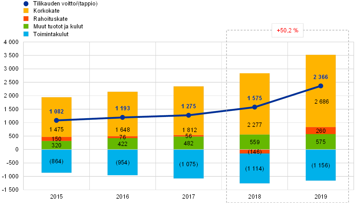 EKP:n vuotuinen voitto on kasvanut tasaisesti vuosina 2015–2019. Vuonna 2015 voitto oli noin 1,1 miljardia euroa ja vuonna 2019 jo noin 2,4 miljardia euroa (ks. kuvio 11). Voiton kasvun taustalla oli pääasiassa valuuttavarannosta ja rahapolitiikan harjoittamista varten pidettävistä arvopapereista kertyneiden korkotuottojen kasvu. Liikkeessä olevista seteleistä[11] ja omien varojen sijoitussalkusta saatujen korkotuottojen supistuminen kuitenkin hillitsi voiton kasvua.