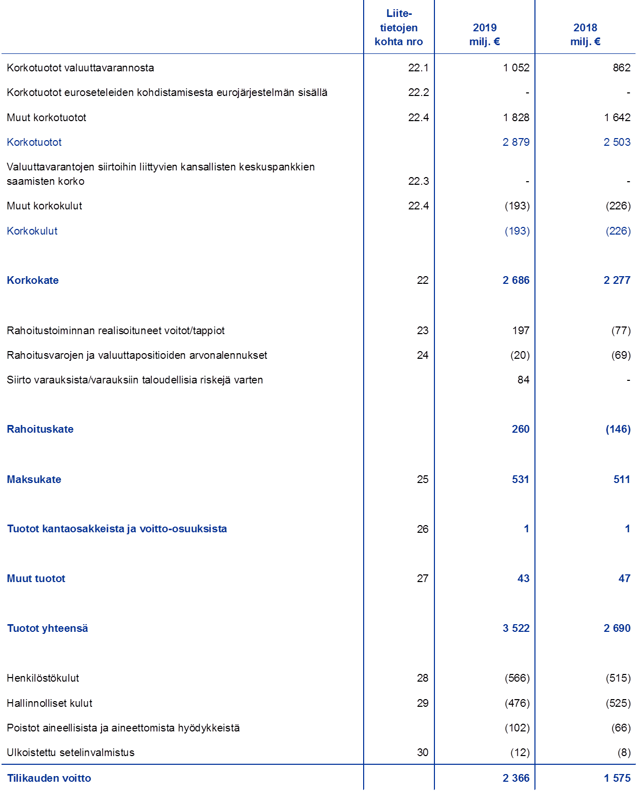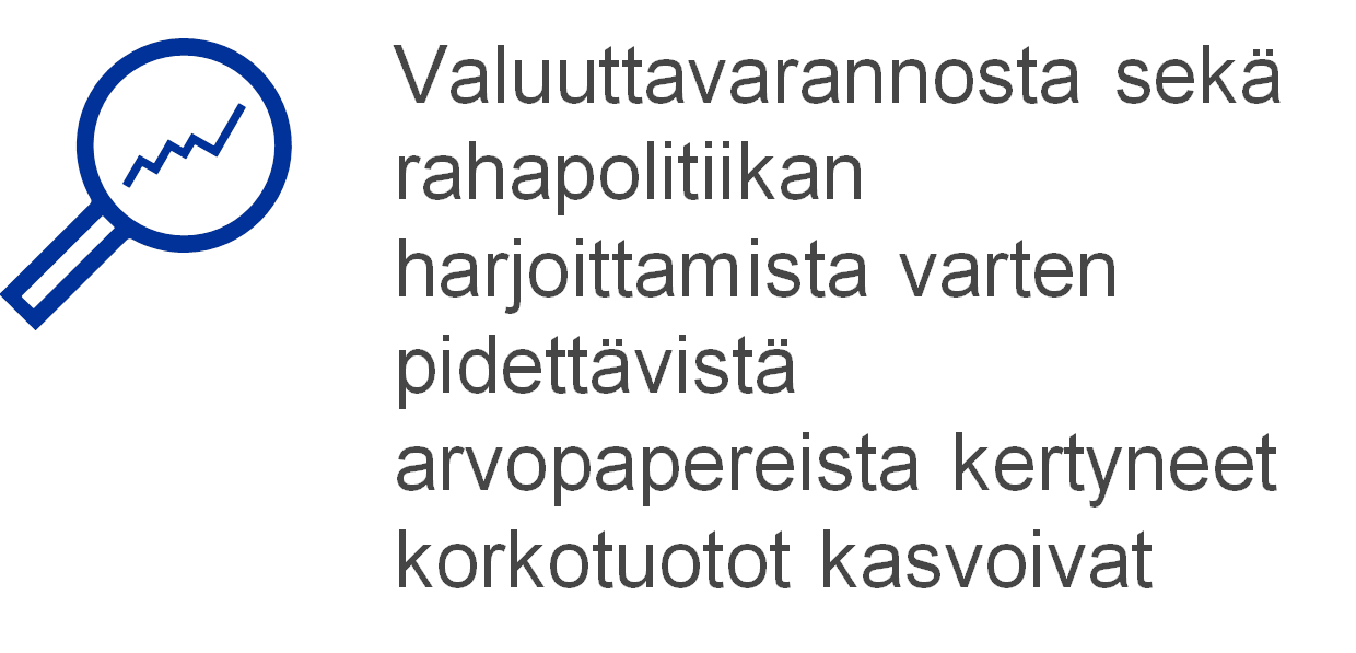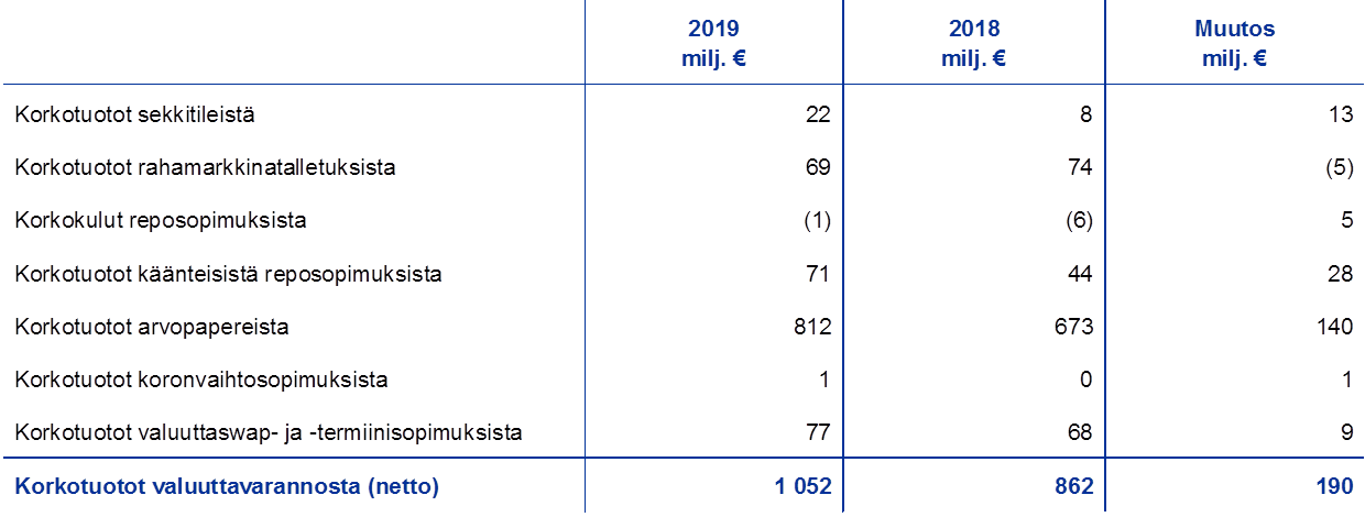 Valuuttavarannosta kertyi korkokatetta 1 052 miljoonaa euroa, eli kasvua oli 190 miljoonaa euroa. Korkokate kasvoi pääasiassa siksi, että Yhdysvaltain dollarin määräisistä arvopapereista kertyneet korkotuotot suurenivat.