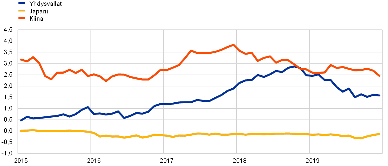 Valtion kahden vuoden joukkolainojen tuotot Yhdysvalloissa, Japanissa ja Kiinassa