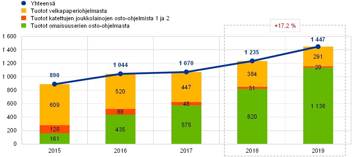 Rahapolitiikan harjoittamista varten pidetyistä arvopapereista kertyi vuonna 2019 korkokatetta 1 447 miljoonaa euroa eli 212 miljoonaa euroa enemmän kuin vuonna 2018 (ks. kuvio 14). Omaisuuserien osto-ohjelmasta (APP) kertynyt korkokate kasvoi 316 miljoonaa euroa 1 136 miljoonaan euroon vuonna 2019, sillä etenkin julkisen sektorin velkapapereiden osto-ohjelman (PSPP) arvopaperisalkku suureni ja tuotti edellisvuoden keskiarvoa paremmin. Viimeisten kahden vuoden aikana salkun keskituotto on suurentunut etenkin siksi, että vuonna 2018 hankitut arvopaperit tuottivat aiempaa keskiarvoa paremmin ja arvopaperien erääntymisen yhteydessä takaisin maksettu pääoma pystyttiin sijoittamaan uudelleen paremmalla tuotolla vuonna 2019. Euroalueen valtioiden joukkolainojen tuotot pysyivät silti keskimäärin pieninä (ks. kuvio 15). Velkapaperiohjelmasta (SMP) sekä kahdesta ensimmäisestä katettujen joukkolainojen osto-ohjelmasta (CBPP 1 ja 2) kertynyt korkokate sitä vastoin pieneni – mutta selvästi vähemmän eli 104 miljoonaa euroa – 311 miljoonaan euroon. Korkotuottojen pieneneminen johtui salkkujen kutistumisesta arvopaperien erääntymisen myötä. Rahapolitiikan harjoittamista varten pidettävistä arvopapereista kertyi vuonna 2019 noin 54 % EKP:n korkokatteesta.