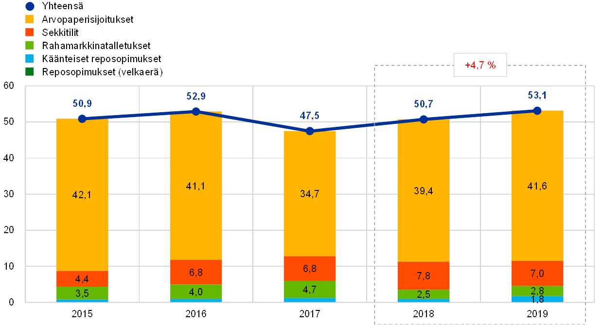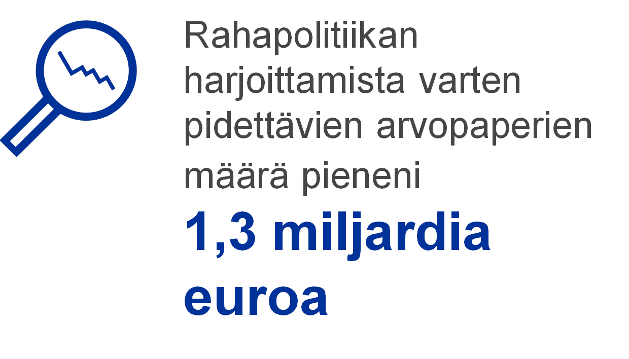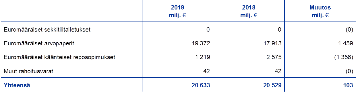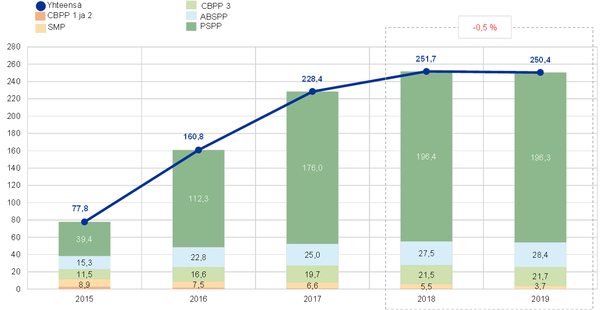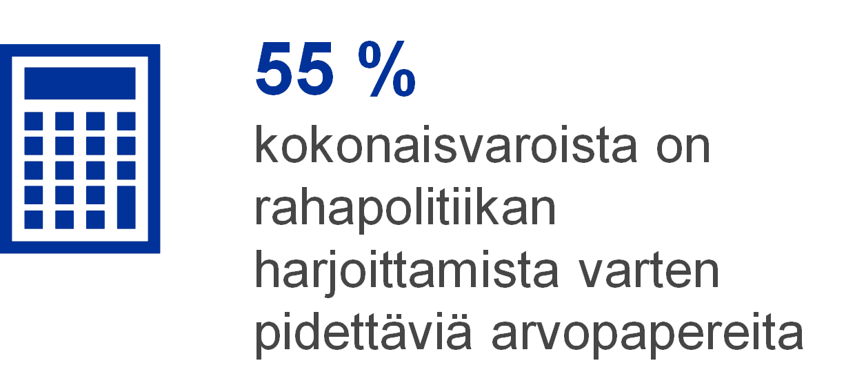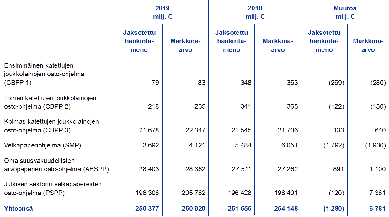 Vuoden 2019 lopussa 55 % EKP:n taseen kokonaisvaroista oli rahapolitiikan harjoittamista varten pidettäviä euromääräisiä arvopapereita. Tase-erään sisältyvät EKP:n hallussa olevat arvopaperimarkkinoita koskevassa ohjelmassa (ns. velkapaperiohjelma), katettujen joukkolainojen osto-ohjelmissa, omaisuusvakuudellisten arvopaperien osto-ohjelmassa sekä julkisen sektorin velkapapereiden osto-ohjelmassa hankitut arvopaperit. Vuonna 2019 EKP sijoitti omaisuuserien osto-ohjelmassa (Asset Purchase Programme, APP) hankittujen omaisuuserien erääntyessä takaisin maksetun pääoman uudelleen täysimääräisesti. Lisäksi EKP:n neuvosto teki 12.9.2019 eurojärjestelmän kuukausittaisten omaisuuseräostojen kokonaismäärää koskevan päätöksen[6], jonka pohjalta omaisuuserien osto-ohjelmassa alettiin 1.11.2019 taas tehdä uusia nettomääräisiä ostoja ennalta määritettyjä kelpoisuuskriteerejä noudattaen.