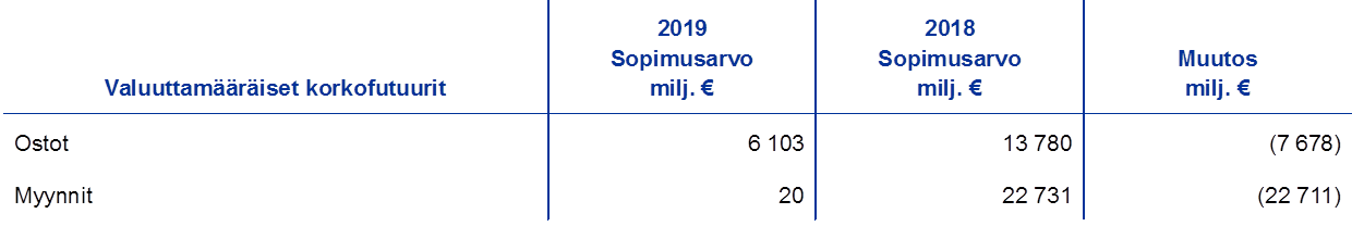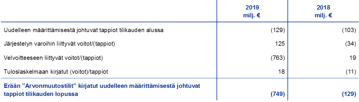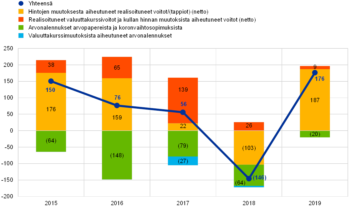 Huom. Arvonmuutostileihin sisältyvät kaikki kullasta, valuutoista ja arvopapereista kirjatut arvostusvoitot mutta eivät työsuhteen päättymisen jälkeisten etuuksien uudelleen määrittämisestä johtuvat erät.