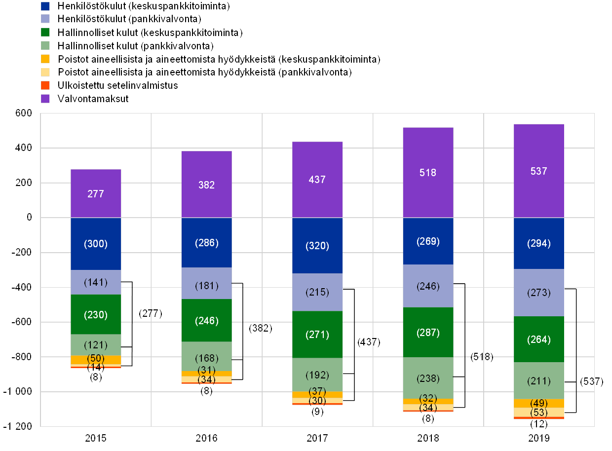 Huom. Toimintakulut on eritelty yhtäältä keskuspankkitoiminnasta ja toisaalta pankkivalvonnasta aiheutuviin kuluihin. Kumpaankin luokkaan on sisällytetty myös EKP:n tukitoimialojen tarjoamista yhteisistä palveluista aiheutuvat kulut. Näitä yhteisiä tukipalveluja ovat muun muassa toimitila- ja henkilöstöhallinnon palvelut, muut hallintopalvelut, budjetointi- ja resurssienhallintapalvelut, kirjanpitopalvelut, oikeudelliset palvelut, viestintä- ja käännöspalvelut, sisäisen tarkastuksen palvelut, tilastopalvelut sekä tietotekniikkapalvelut.