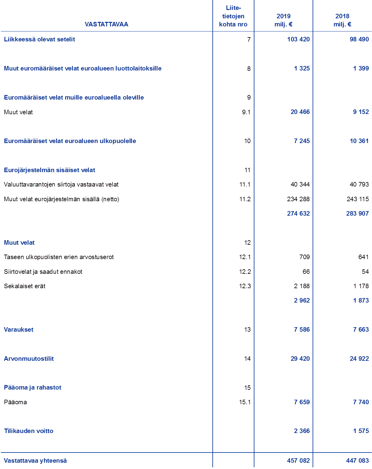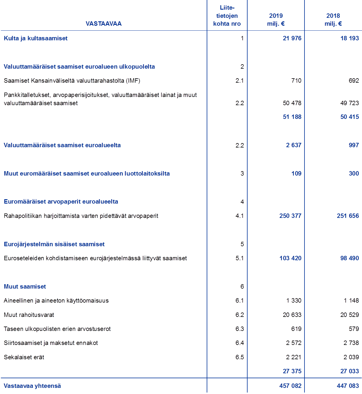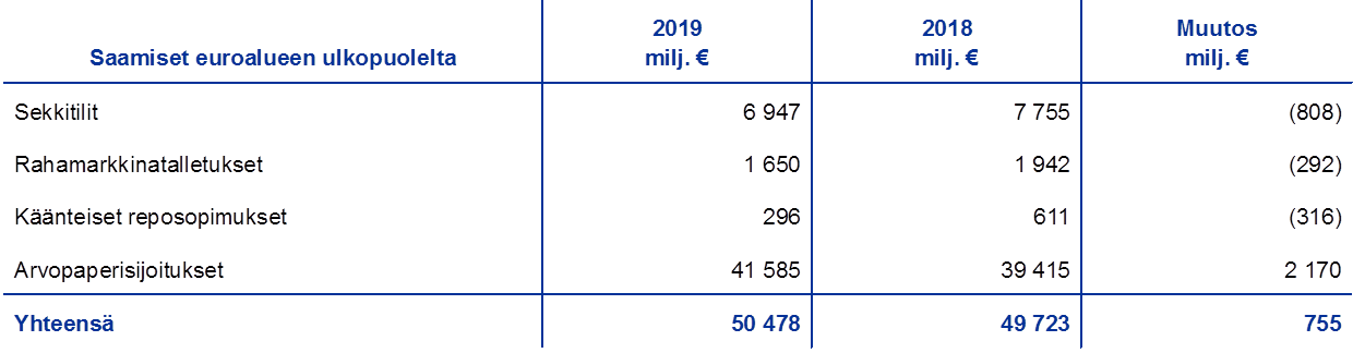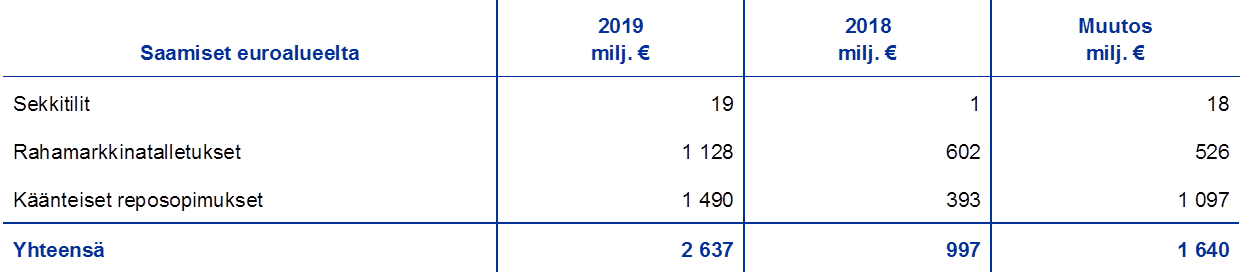 - Valuuttavarantosaamiset sisältyvät taseen eriin ”Pankkitalletukset, arvopaperisijoitukset, valuuttamääräiset lainat ja muut valuuttamääräiset saamiset euroalueen ulkopuolelta” ja ”Valuuttamääräiset saamiset euroalueelta”.