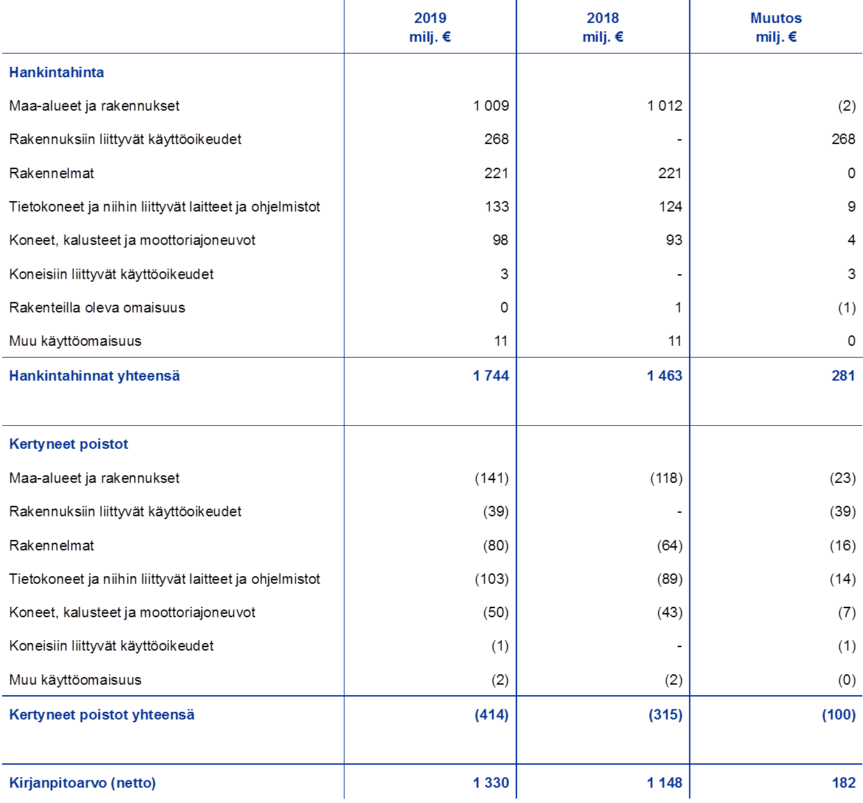 Hallinnollisten kulujen väheneminen vuonna 2019 johtui pääasiassa tilavuokraus-, vuokratyöntekijä- ja konsulttikulujen pienenemisestä. Vuokrakulujen pienenemisen taustalla olivat taseeseen kirjatut rakennusten käyttöoikeudet (ks. kirjanpitoperiaatteita käsittelevän osan 2.3 kohta ”Kirjanpitoperiaatteiden muutokset” ja liitetietojen kohta 6.1 ”Aineellinen ja aineeton käyttöomaisuus”) sekä vastaavien kulujen kirjaaminen poistoina.