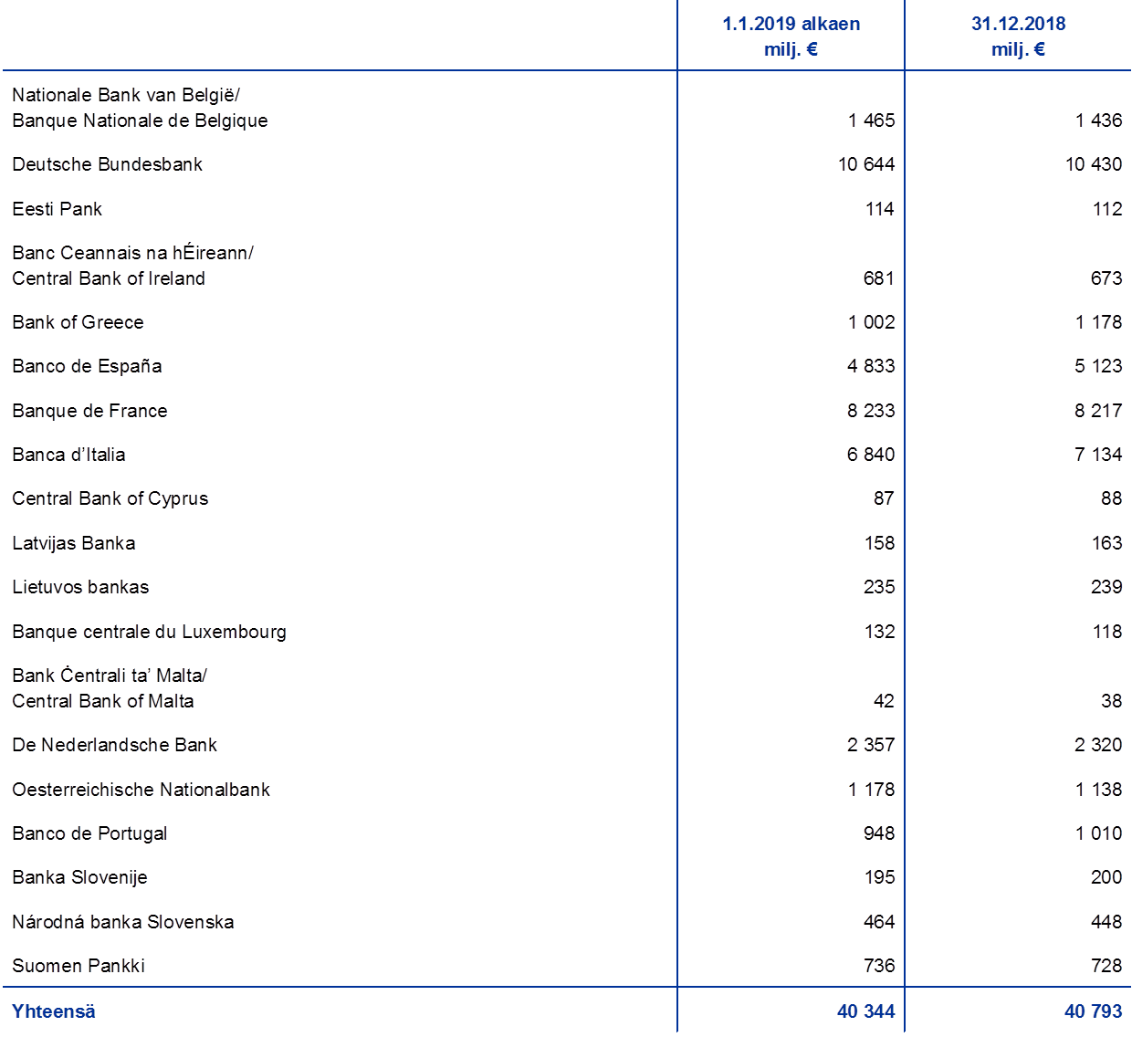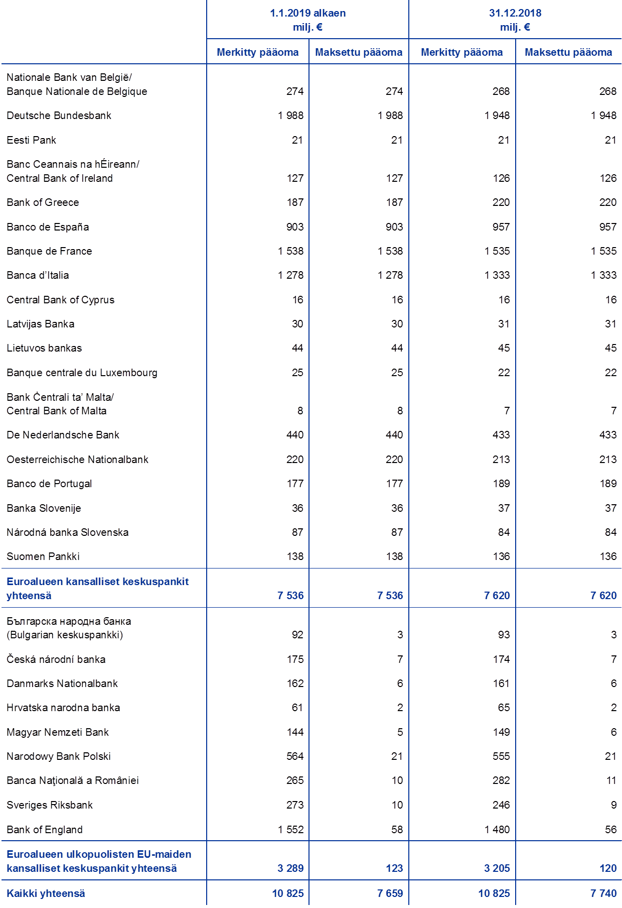 Euroalueen maiden ja euroalueeseen kuulumattomien EU-maiden kansallisten keskuspankkien maksaman EKP:n pääoman määrä oli vuoden 2019 lopussa 7,7 miljardia euroa eli 81 miljoonaa euroa pienempi kuin vuoden 2018 lopussa. Taustalla oli EKP:n pääoman jakoperusteen viisivuotistarkistus, jonka myötä (merkitsemänsä pääoman kokonaan maksavien) euroalueen kansallisten keskuspankkien merkintäosuudet pienenivät 1.1.2019.