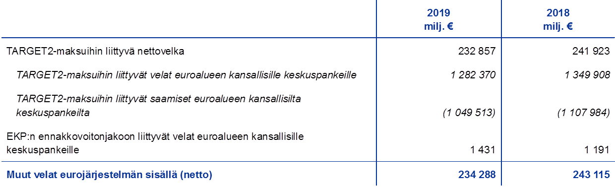 - Euroalueen ulkopuolisten EU-maiden kansallisista keskuspankeista TARGET2-järjestelmään osallistuivat 31.12.2019 Bulgarian, Tanskan, Kroatian, Puolan ja Romanian keskuspankit.