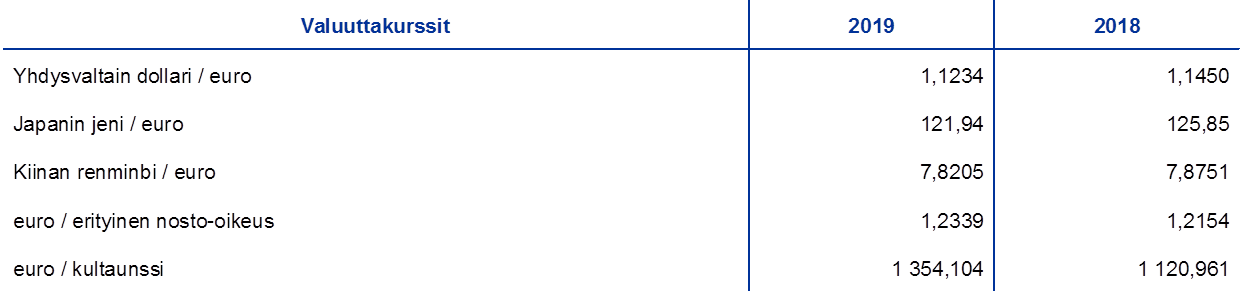 Tärkeimmät valuuttakurssit ja kullan hinta vuosina 2015–2019