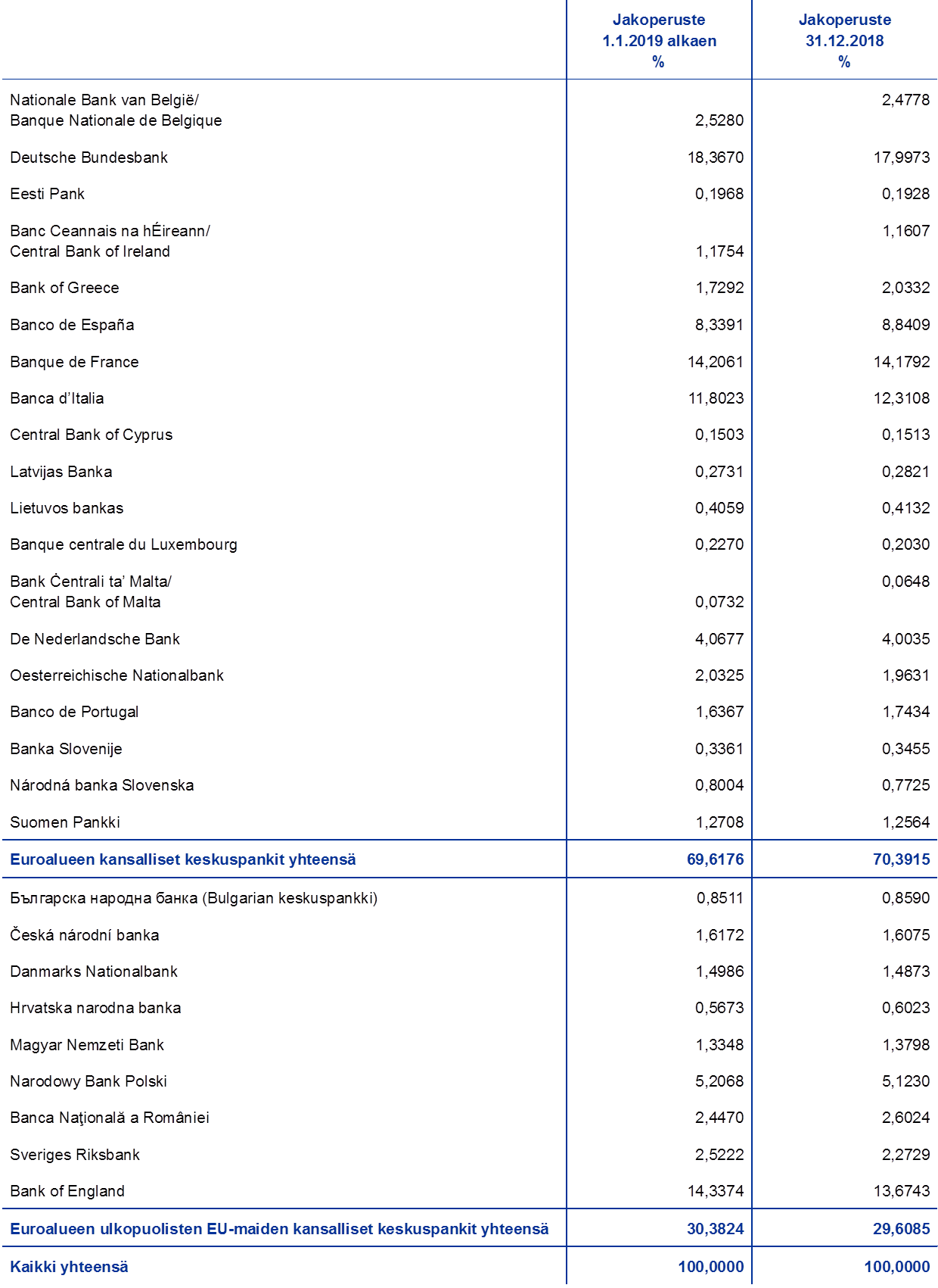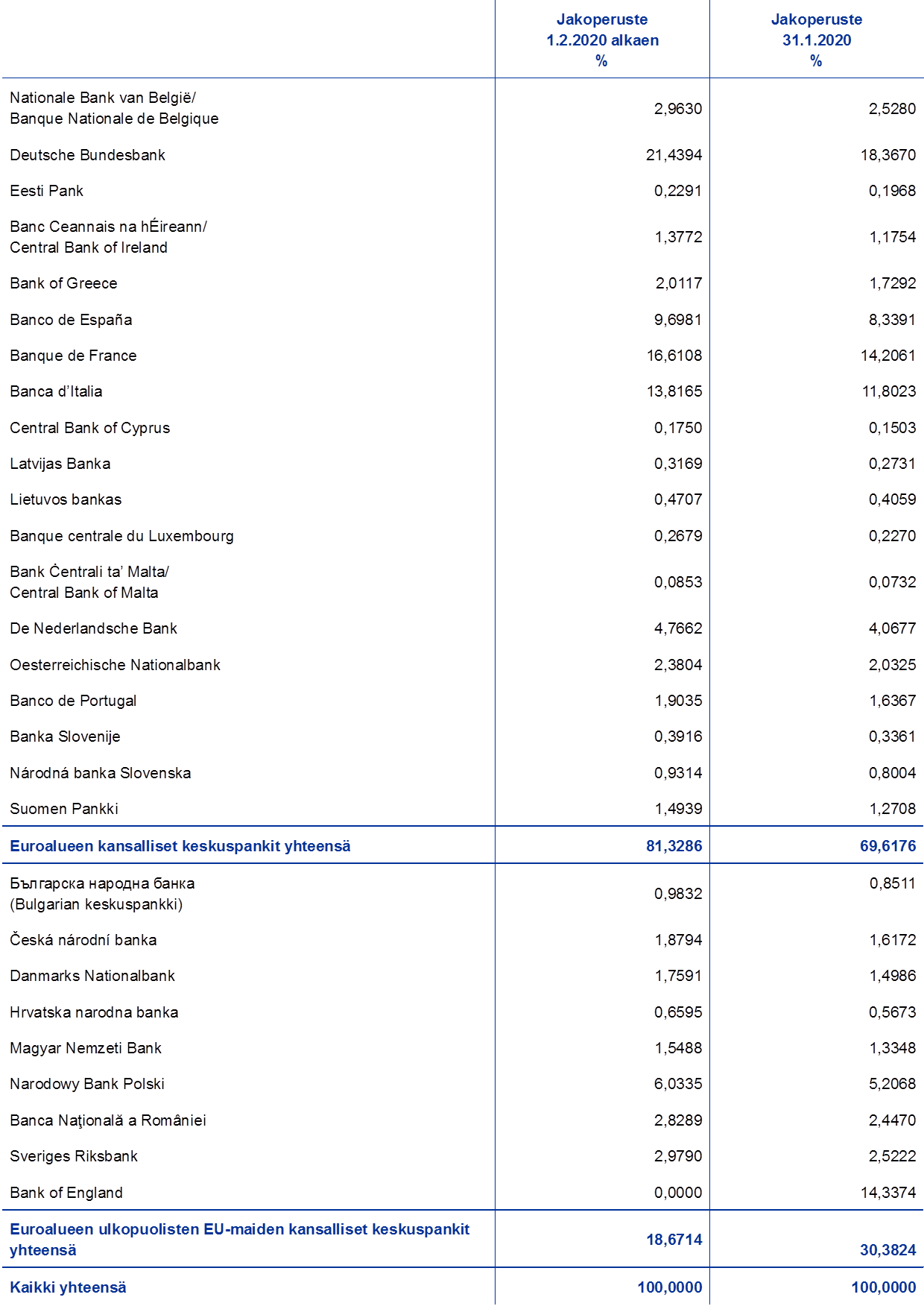Ison-Britannian erottua EU:sta Englannin pankki ei ole enää osa EKPJ:tä, joten kansallisten keskuspankkien osuudet EKP:n pääoman jakoperusteessa muuttuvat. Muutos tulee voimaan 1.2.2020 seuraavasti: