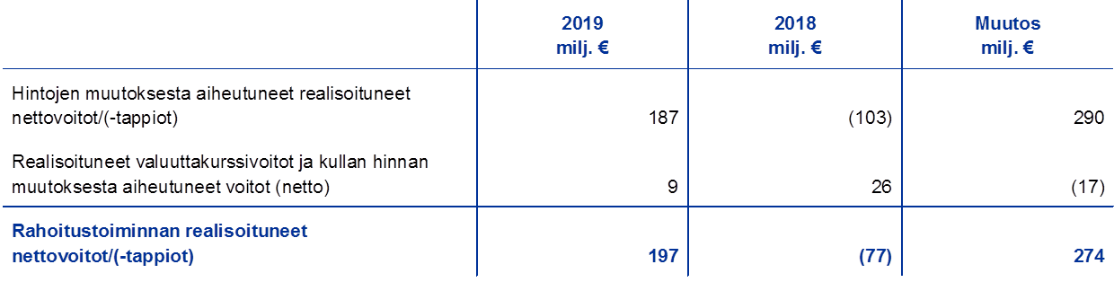 Rahoituskate kasvoi edellisvuodesta 322 miljoonaa euroa ja oli 176 miljoonaa euroa voitollinen (ks. kuvio 16). Syynä oli pääasiassa se, että hintojen muutoksista realisoitui edellisvuotista parempi nettotulos.
