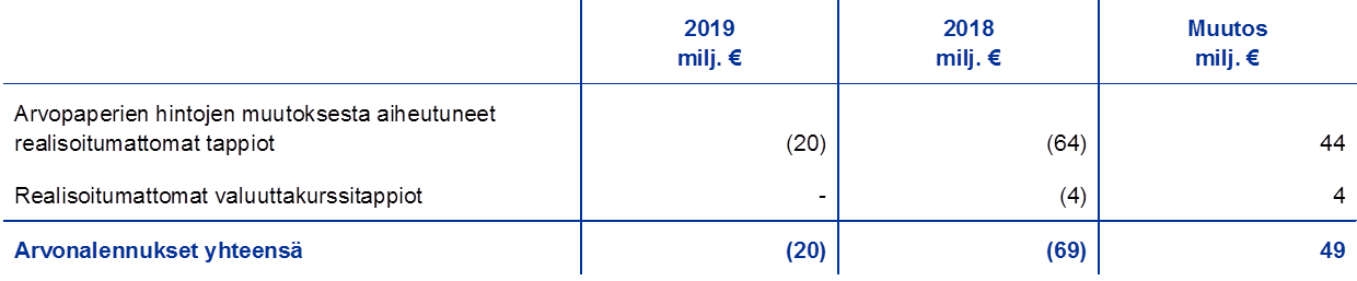 Useiden omien varojen sijoitussalkussa ja Yhdysvaltain dollarin määräisessä sijoitussalkussa olevien arvopaperien markkina-arvo laski tuottojen kasvun myötä loppuvuodesta 2019, mistä aiheutui realisoitumattomia tappioita vuoden lopussa.