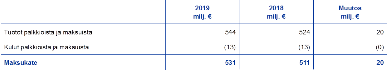 EKP:n toteutuneisiin pankkivalvontakuluihin perustuvat valvontamaksutuotot vuodelta 2019 olivat 537 miljoonaa euroa. Arvioitujen kulujen (559 miljoonaa euroa) ja toteutuneiden kulujen (537 miljoonaa euroa) erotuksesta muodostuva 22 miljoonan euron ylijäämä vuodelta 2019 kirjataan erään ”Siirtovelat ja saadut ennakot” (ks. liitetietojen kohta 12.2, ”Siirtovelat ja saadut ennakot”), ja se vähennetään vuoden 2020 valvontamaksuista, jotka peritään uuden valvontamaksuasetuksen[39] mukaisesti jälkikäteen vuonna 2021.