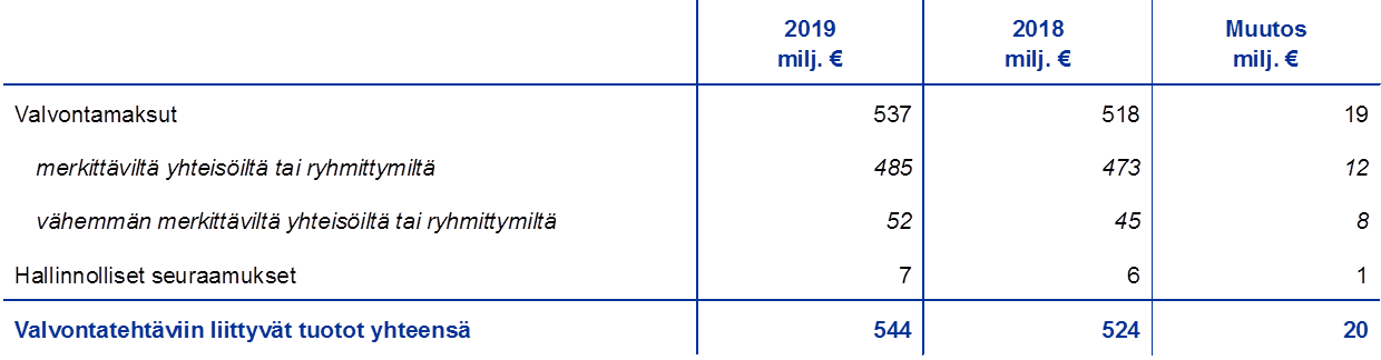 Valvontatehtäviin liittyvät EKP:n tuotot muodostuivat siis vuonna 2019 seuraavasti: