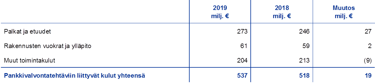 Palkkojen ja etuuksien määrä kasvoi vuonna 2019 siksi, että pankkivalvonnan palveluksessa oli keskimäärin enemmän henkilöstöä kuin edellisvuonna. Henkilöstömäärän kasvu lisäsi myös toimitiloista aiheutuneita kustannuksia. Muiden toimintakulujen pieneneminen johtui pääasiassa valvontatehtäviin ja etenkin vuonna 2020 päättyvään sisäisten mallien erityisarviointiin liittyvien konsulttikulujen supistumisesta.