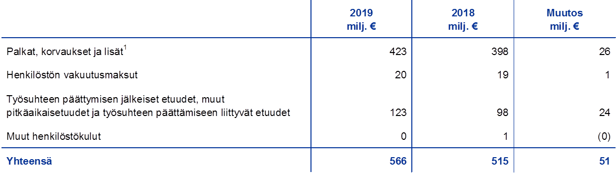 Henkilöstökulut kasvoivat tilikauden aikana pääasiassa sen vuoksi, että EKP:n palkkalistoilla oli keskimäärin enemmän työntekijöitä ja muut pitkäaikaisetuudet kasvoivat lähinnä siksi, että vuoden 2019 lopun vakuutusmatemaattisessa arvostuksessa käytettiin alempaa diskonttokorkoa (ks. kohta 12.3, ”Sekalaiset erät”).