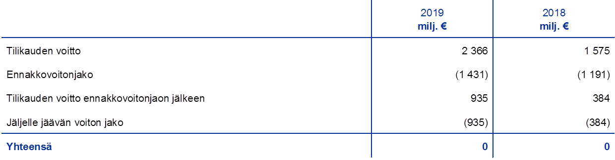 EKP:n nettovoitto vuodelta 2019 oli 2 366 miljoonaa euroa. EKP:n neuvoston päätöksen mukaisesti euroalueen kansallisille keskuspankeille jaettiin ennakkovoitonjakona 1 431 miljoonaa euroa 31.1.2020. EKP:n neuvosto päätti jakaa voitosta jäljellä olevat 935 miljoonaa euroa euroalueen kansallisten keskuspankkien kesken.