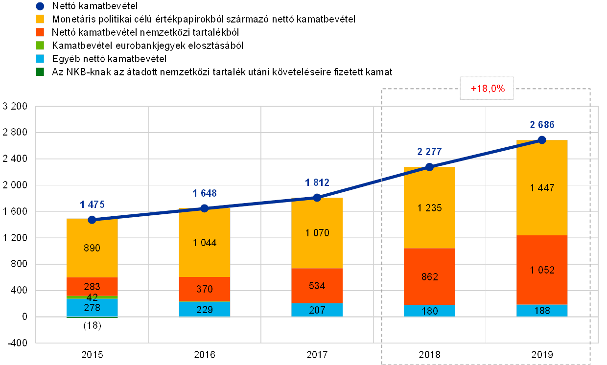 A 2015–19-es időszakban az EKB nyeresége fokozatosan emelkedett, körülbelül 1,1 milliárd euróról körülbelül 2,4 milliárd euróra (lásd a 11. diagramot), ami elsősorban a nemzetközi tartalékon és a monetáris politikai célú értékpapír-állományon keletkező magasabb kamatbevételnek tudható be. Ez bőségesen ellensúlyozza a forgalomban lévő bankjegyeken[11] és a saját vagyonalap-portfólión keletkezett kamatbevétel visszaesését.