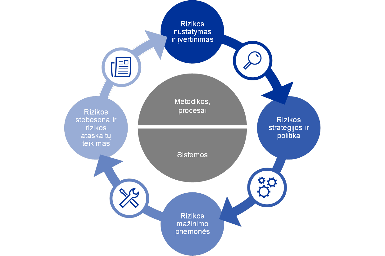Rizikos valdymas yra esminė ECB veiklos dalis. Tai atliekama nuolat i) nustatant ir vertinant riziką, ii) peržiūrint rizikos strategiją ir politiką, iii) įgyvendinant rizikos mažinimo priemones, iv) stebint riziką ir apie ją pranešant. Atlikti visą šitą darbą padeda veiksmingos metodikos, procesai ir sistemos.