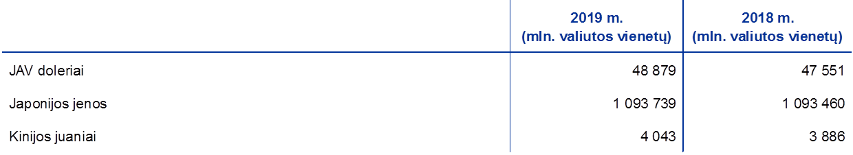 2019 m. pabaigoje JAV doleriai ir toliau sudarė didžiausią ECB užsienio valiutos atsargų dalį – apie 77 %.