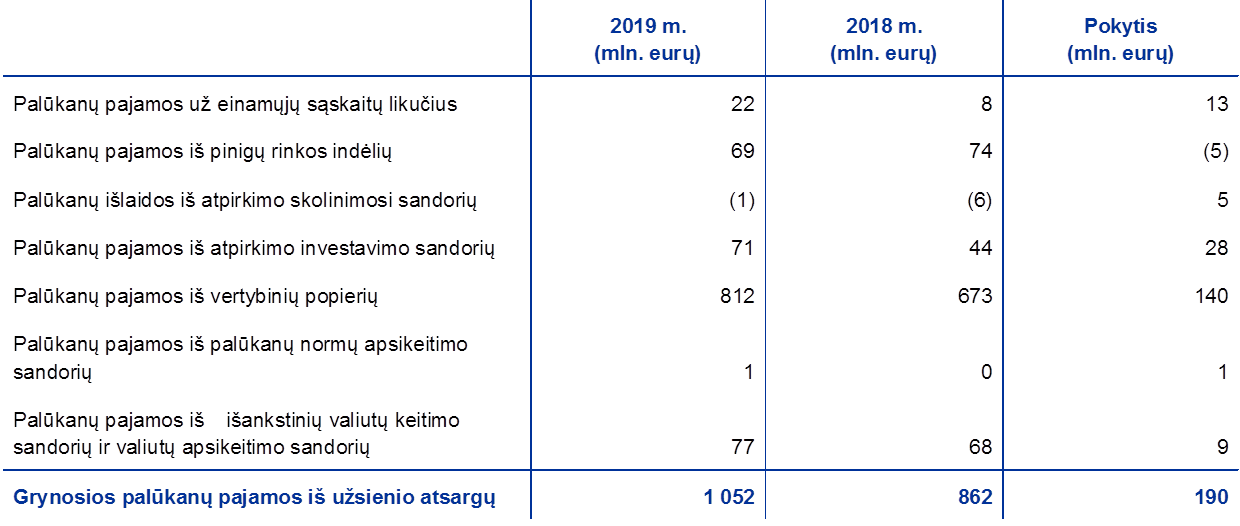 Grynosios palūkanų pajamos iš užsienio atsargų padidėjo 190 mln. – iki 1 052 mln. eurų, nes uždirbta daugiau palūkanų pajamų iš JAV doleriais išreikštų vertybinių popierių.