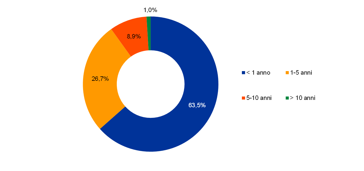 Il portafoglio detenuto a fronte dei fondi propri della BCE è costituito prevalentemente dagli investimenti delle sue risorse finanziarie, ossia il capitale versato e le consistenze del fondo di riserva generale e del fondo di accantonamento a fronte dei rischi finanziari. Per effetto del reinvestimento dei proventi e della valutazione dei titoli ai prezzi di mercato, l’ammontare del portafoglio e quello delle suddette risorse finanziarie non corrispondono necessariamente. La finalità del portafoglio è fornire un reddito che contribuisca a finanziare le spese operative della BCE non connesse alle funzioni di vigilanza[13]. Il portafoglio è investito in attività denominate in euro, rispettando i limiti imposti dal sistema di controllo dei rischi. La struttura per scadenze risulta quindi più differenziata (grafico 9) rispetto a quella del portafoglio delle riserve valutarie.