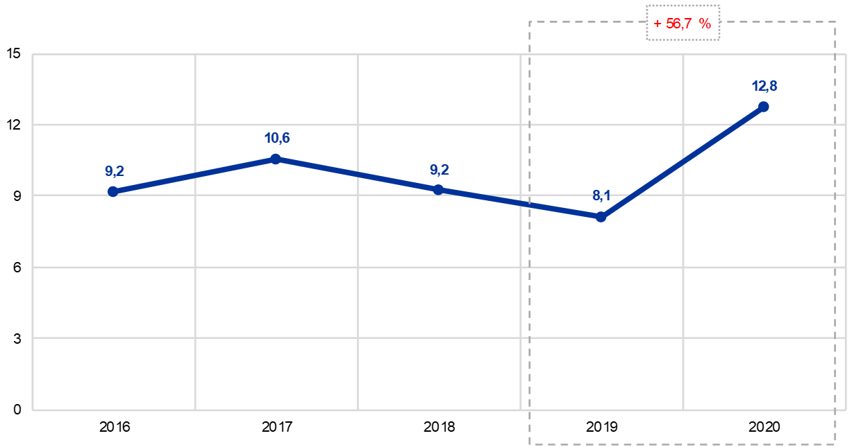 2020 m. pabaigoje, palyginti su 2019 m. pabaiga, bendra apyvartoje cirkuliuojančių eurų banknotų vertė padidėjo 11 % – iki 1 434,5 mlrd. eurų. ECB paskirta 8 % visų apyvartoje cirkuliuojančių eurų banknotų vertės. Metų pabaigoje ji sudarė 114,8 mlrd. eurų. Kadangi pats ECB neleidžia banknotų, jis turi vidinių Eurosistemos pretenzijų euro zonos NCB atžvilgiu, kurios atspindi apyvartoje cirkuliuojančių banknotų vertę.