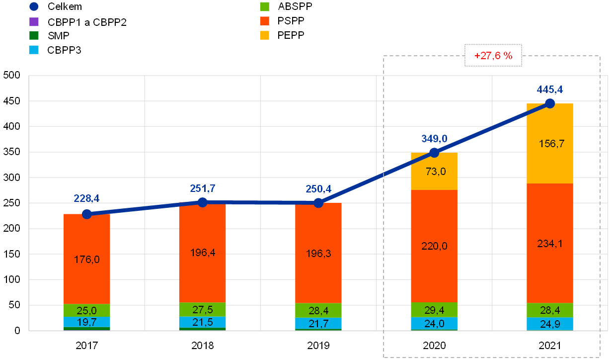 Na základě příslušných rozhodnutí Rady guvernérů pokračovala ECB v roce 2021 ve svých čistých nákupech cenných papírů v rámci APP a PEPP včetně reinvestování jistin ze splatných cenných papírů zakoupených v rámci těchto programů. V důsledku těchto nákupů se portfolio cenných papírů držených ECB pro účely měnové politiky zvýšilo o 96,4 mld. EUR na 445,4 mld. EUR (graf 2), přičemž většinu tohoto nárůstu představují nákupy v rámci PEPP. Pokles 1,3 mld. EUR v rámci SMP, CBPP1 a CBPP2 byl způsoben splacením cenných papírů.