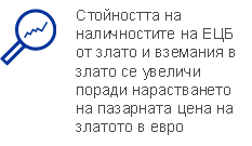 Равностойността в евро на наличностите на ЕЦБ от злато и вземания в злато се увеличи през 2022 г. с 1,6 млрд. евро до 27,7 млрд. евро (Графика 4) поради нарастване на пазарната цена на златото в евро, като размерът на наличностите в унции чисто злато остана непроменен. Това нарастване доведе и до увеличение в същия размер в сметките на ЕЦБ за преоценка на златото (вижте раздел 1.3.2 „Финансови ресурси“).