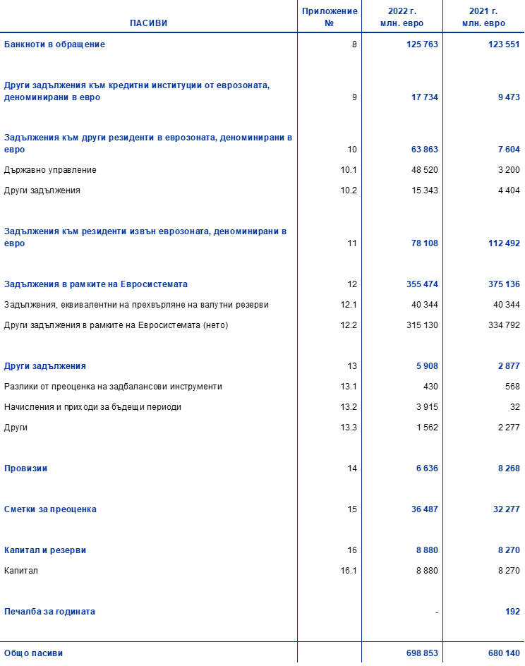 През 2022 г. балансовото число на ЕЦБ е нараснало с 18,7 млрд. евро до 698,9 млрд. евро, главно поради нейния дял в покупките на ценни книжа по PEPP и по APP. Тези покупки доведоха до увеличение на ценните книжа, държани за целите на паричната политика, а паричният им сетълмент посредством сметки в TARGET2 доведе до съответно нарастване на задълженията в рамките на Евросистемата. Това увеличение на задълженията в рамките на Евросистемата беше неутрализирано изцяло от входящи парични потоци в резултат от по-големи депозити на резиденти на еврозоната при ЕЦБ, което същевременно доведе до нарастване на други пасиви.