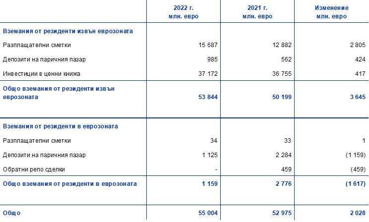 Тези наличности се състоят от активи, включени в балансовите показатели Вземания от резиденти извън еврозоната, деноминирани в чуждестранна валута – Салда в банки и инвестиции в ценни книжа, външни заеми и други външни активи и Вземания от резиденти в еврозоната, деноминирани в чуждестранна валута.
