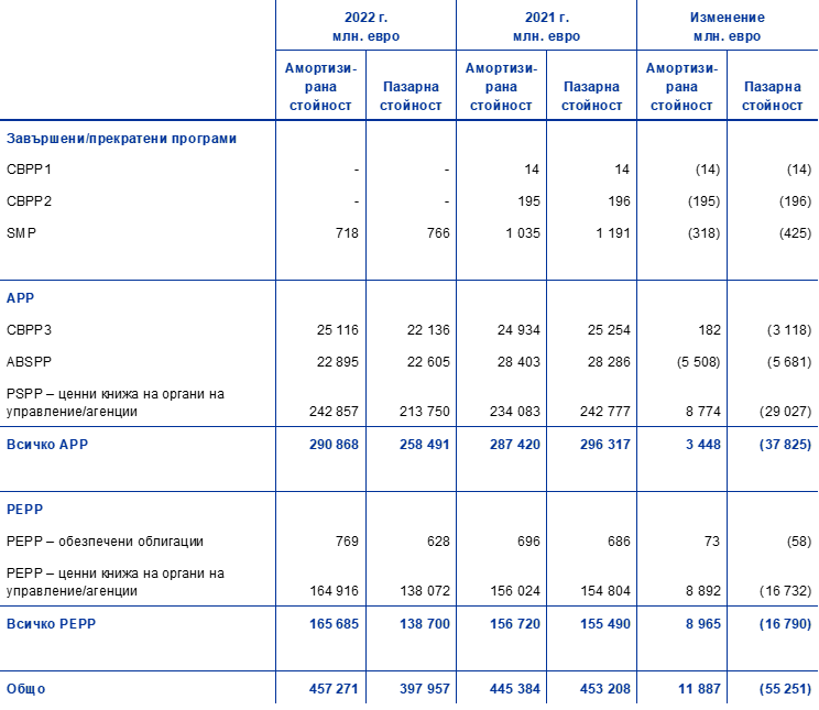 Въз основа на съответните решения на Управителния съвет ЕЦБ продължи да извършва нетни покупки на ценни книжа по PEPP до края на март 2022 г., а нетните покупки по APP бяха прекратени от 1 юли 2022 г. Същевременно погашенията по главници на ценните книжа с настъпващ падеж, държани в тези два портфейла, все така се реинвестираха в пълен размер в хода на годината. В резултат от тези покупки и реинвестиции портфейлът от ценни книжа, държани от ЕЦБ за целите на паричната политика, нарасна с 11,9 млрд. евро до 457,3 млрд. евро (Графика 2), като наличностите по PEPP и PSPP се увеличиха съответно с 9,0 млрд. евро и 8,8 млрд. евро. Спадът с 5,5 млрд. евро на наличностите по ABSPP се дължи на изплащания.
