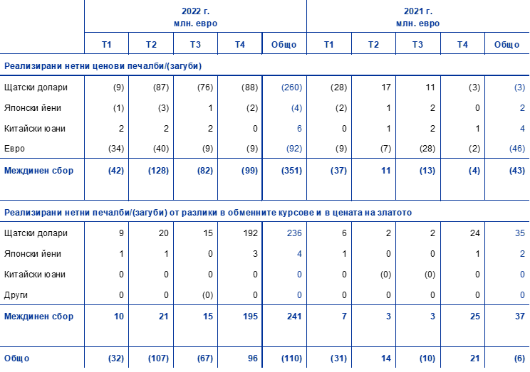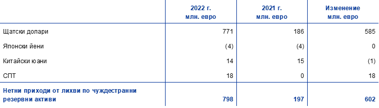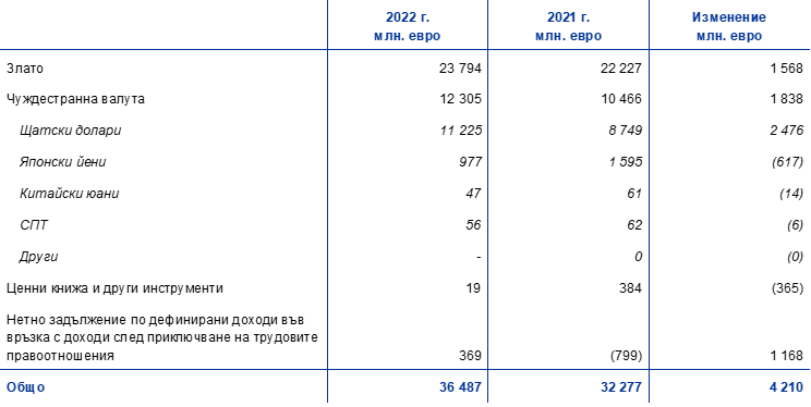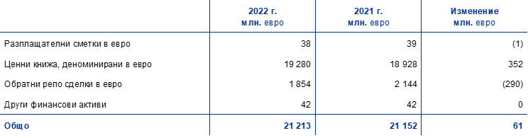 През 2022 г. общата равностойност в евро на чуждестранните резервни активи на ЕЦБ, които се състоят от злато, специални права на тираж, щатски долари, японски йени и китайски юани, се увеличи с 4,1 млрд. евро до 84,5 млрд. евро.