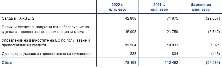 Ако в края на годината останат неинвестирани обезпечения под формата на парични средства, тези транзакции се записват по балансови сметки (вижте приложение 9 Други задължения към кредитни институции от еврозоната, деноминирани в евро и приложение 11 Задължения към резиденти извън еврозоната, деноминирани в евро).
