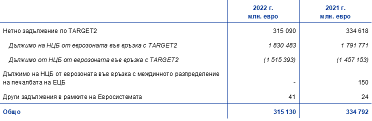 Задълженията на ЕЦБ в рамките на Евросистемата, които се състоят основно от нетните салда на НЦБ от еврозоната спрямо ЕЦБ в TARGET2 и задълженията, свързани с чуждестранните резервни активи, прехвърлени на ЕЦБ от НЦБ от еврозоната при присъединяването им към Евросистемата, спаднаха през 2022 г. с 19,7 млрд. евро до 355,5 млрд. евро.