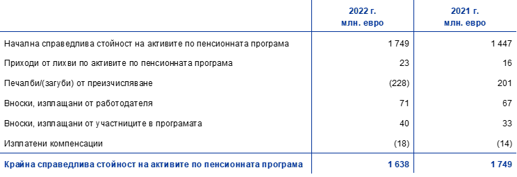 Стълбът на дефинирани доходи в пенсионната програма отразява само задължителните вноски от ЕЦБ и служителите. Доброволните вноски на служителите в стълба на дефинирани вноски са в размер на 189 млн. евро през 2022 г. (спрямо 220 млн. евро през 2021 г.). Тези вноски са инвестирани в активите по пенсионната програма и пораждат съответстващо задължение на същата стойност.