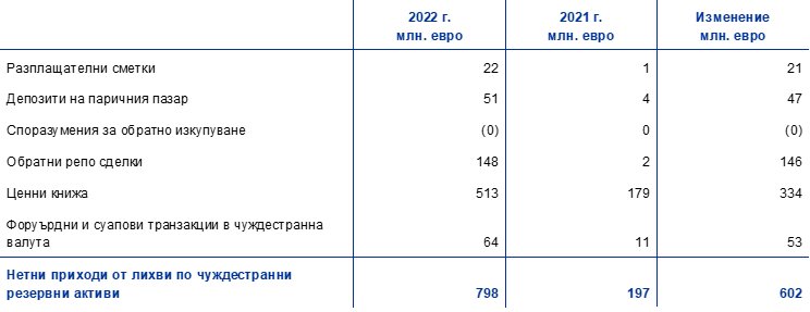 Нетният доход от лихви по чуждестранните резервни активи се увеличи с 602 млн. евро до 798 млн. евро, предимно в резултат от по-високите приходи от лихви от ценните книжа, деноминирани в щатски долари. През 2022 г. средната доходност по портфейла на ЕЦБ в щатски долари се увеличи в сравнение с предходната година поради i) продажби и изплащания на закупени преди облигации с по-ниска доходност и ii) покупки на ценни книжа с по-висока доходност поради повишаването на доходността на облигациите в щатски долари от края на 2021 г. насам (Графика 17).