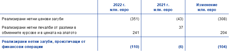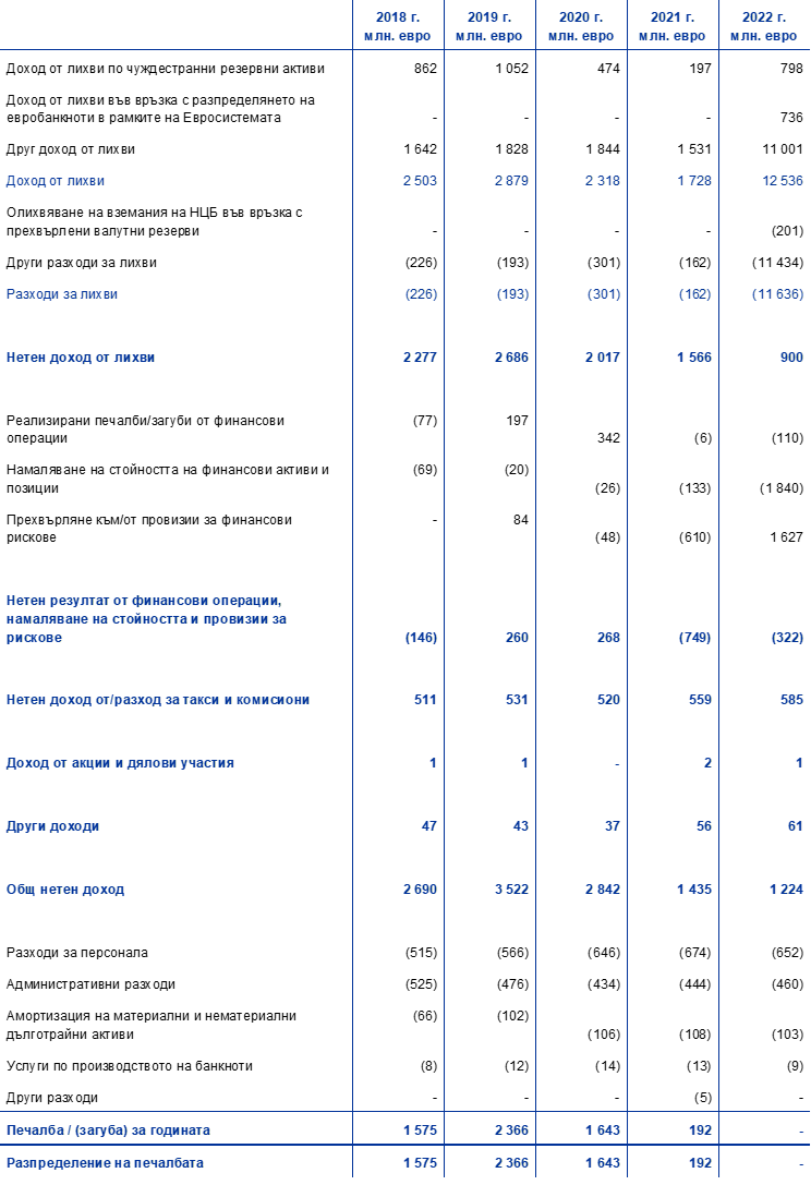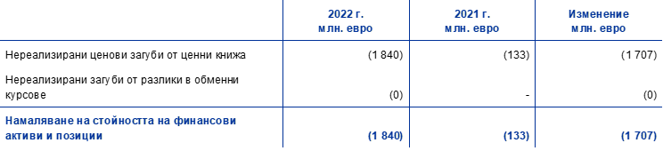 След освобождаването на 1627 млн. евро от провизиите за финансови рискове, за да бъдат компенсирани понесените през 2022 г. загуби, финансовият резултат на ЕЦБ е нула (спрямо 192 млн. евро през 2021 г.). Загубите възникнаха главно от i) разходите за лихви в резултат на нетното задължение на ЕЦБ в TARGET2 и ii) отрицателния нетен резултат от финансови операции и обезценки (Графика 13).