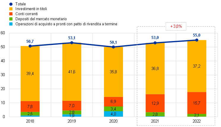 A fine 2022 il valore complessivo delle banconote in euro in circolazione, pari a 1.572,0 miliardi di euro, è aumentato dell’1,8% rispetto al livello di fine 2021. Alla BCE è attribuita una quota dell’8% del valore totale dei biglietti in euro in circolazione, che ammonta a 125,8 miliardi di euro a fine esercizio. Non emettendo banconote, la BCE detiene crediti interni all’Eurosistema verso le BCN dei paesi dell’area dell’euro per un importo equivalente al valore dei biglietti in circolazione a essa assegnati.