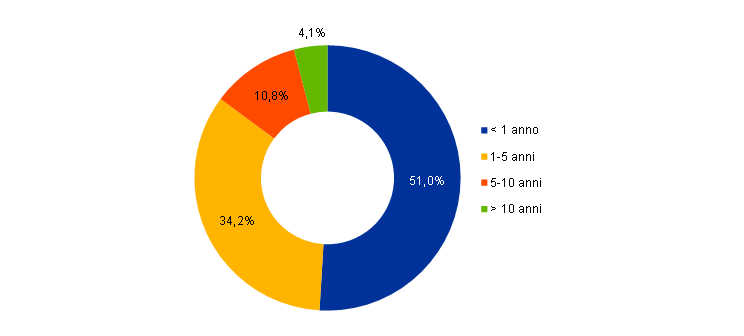 Il portafoglio detenuto a fronte dei fondi propri della BCE è costituito prevalentemente dagli investimenti delle sue risorse finanziarie, ossia il capitale versato e le consistenze del fondo di riserva generale e del fondo di accantonamento a fronte dei rischi finanziari. La finalità del portafoglio è fornire un reddito che contribuisca a finanziare le spese operative della BCE non connesse alle funzioni di vigilanza[12]. Il portafoglio è investito in attività denominate in euro, rispettando i limiti imposti dal sistema di controllo dei rischi. La struttura per scadenze risulta quindi più differenziata (grafico 9) rispetto a quella del portafoglio delle riserve valutarie.