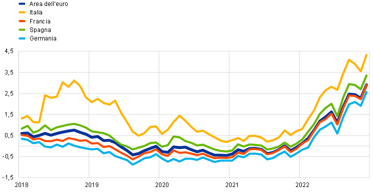 A dicembre 2022 il Consiglio direttivo ha annunciato[8] che, a partire dagli inizi di marzo 2023, il portafoglio del PAA si sarebbe ridotto a un ritmo misurato e prevedibile, in quanto l’Eurosistema avrebbe reinvestito solo in parte il capitale rimborsato sui titoli in scadenza. Il ritmo di tale riduzione sarà in media pari a 15 miliardi di euro al mese sino alla fine di giugno 2023 e verrà poi determinato nel corso del tempo. Il Consiglio direttivo continuerà a reinvestire integralmente il capitale rimborsato sui titoli in scadenza nell’ambito del PEPP almeno sino alla fine del 2024, in modo flessibile nel corso del tempo, fra le varie classi di attività e fra i vari paesi, per contrastare i rischi per il meccanismo di trasmissione della politica monetaria riconducibili alla pandemia di coronavirus (COVID-19).