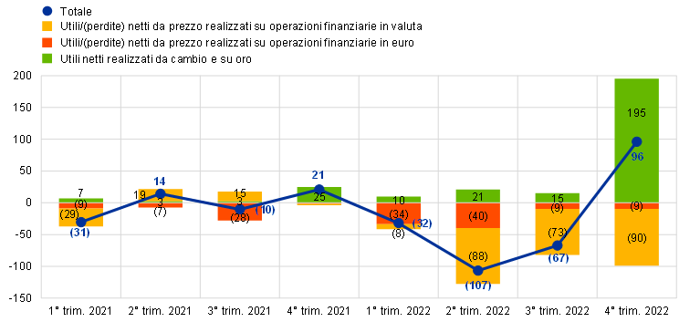 A seguito dell’utilizzo di 1.627 milioni di euro del fondo di accantonamento a fronte dei rischi finanziari a copertura delle perdite registrate nel 2022, il risultato economico della BCE è pari a zero (192 milioni di euro nel 2021). Tali perdite sono attribuibili principalmente (1) agli interessi passivi sul saldo netto Target2 della BCE e (2) al risultato netto negativo delle operazioni finanziarie e delle svalutazioni di attività finanziarie (grafico 13).