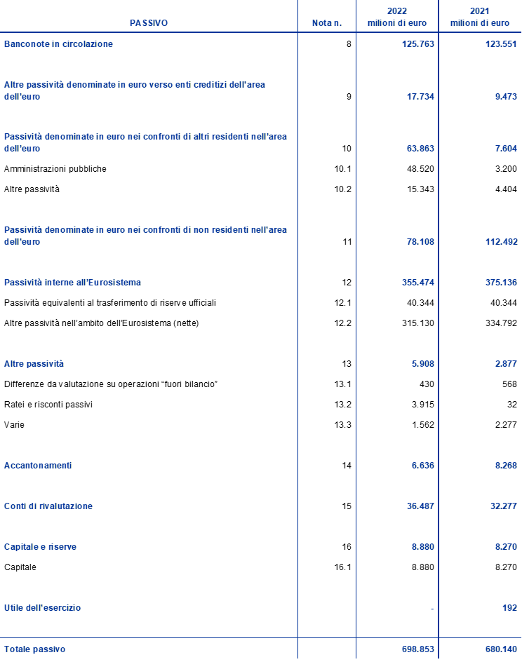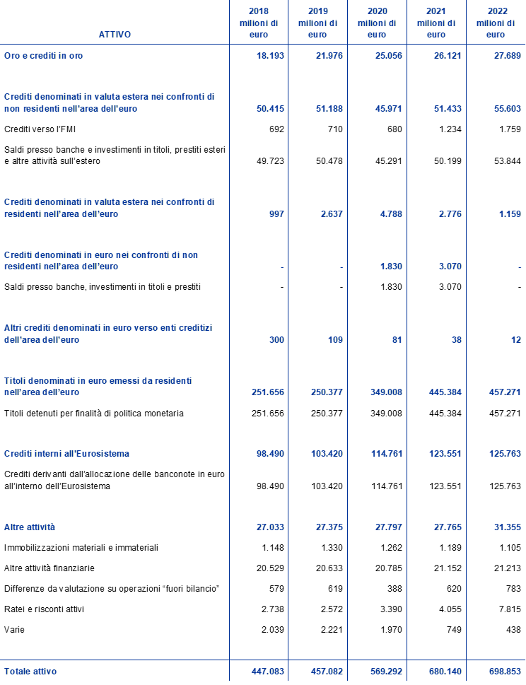 Nel 2022 lo stato patrimoniale della BCE ammonta a 698,9 miliardi di euro, con un incremento di 18,7 miliardi di euro principalmente connesso alla quota della Banca di acquisti di titoli nell’ambito del PEPP e del PAA. Tali acquisti hanno dato luogo a un aumento dei titoli detenuti per finalità di politica monetaria, mentre il loro regolamento in moneta di banca centrale sui conti Target2 ha determinato un analogo incremento delle passività interne all’Eurosistema. Quest’ultimo incremento è stato più che compensato dai flussi di liquidità in entrata a seguito dei maggiori depositi detenuti presso la BCE da residenti nell’area dell’euro, che si sono riflessi in una crescita delle altre passività.